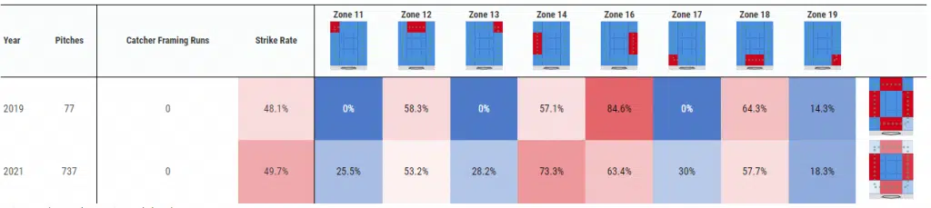 Unlike Yaz, Collins didn’t make up for any defensive liabilities with his bat. In 2021, he slashed .210/.330/.338 with four home runs, good for a wRC+ of 90. In his defense, as a left-handed bat, Collins should have only been deployed against righties and not against lefties. However, due to both Lucas Giolito’s and Carlos Rodón’s seemingly insistence to have Collins as their personal catcher at all times, even with Grandal healthy, Collins would sometimes face lefties to his detriment. Regardless, he only slashed .222/.349/.361, good for a wRC+ of 101 against righties in 2021. This is not overly impressive. Despite a credible OBP, his bat is still barely above average by definition.