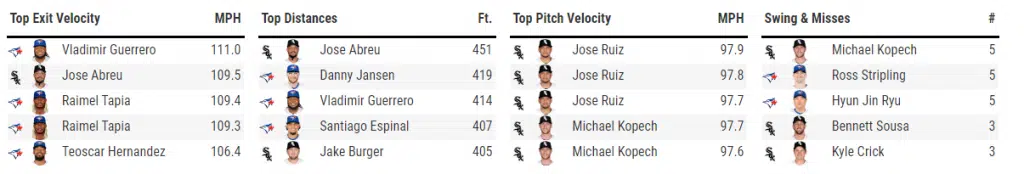 The bullpen, for the most part, was pretty good tonight. Kyle Crick, who is up due to Graveman being put on the restricted list, pitched two scoreless innings with three strikeouts. Foster and Ruiz each put up a scoreless inning of their own. Sousa had some trouble as Vladimir Guerrero Jr took him deep to put the Blue Jays up by four.