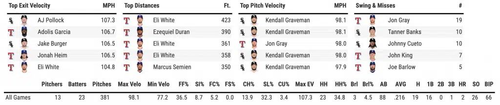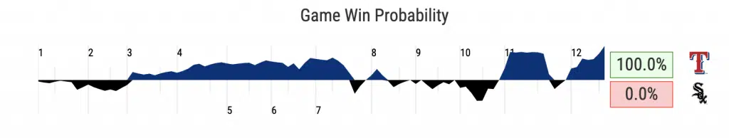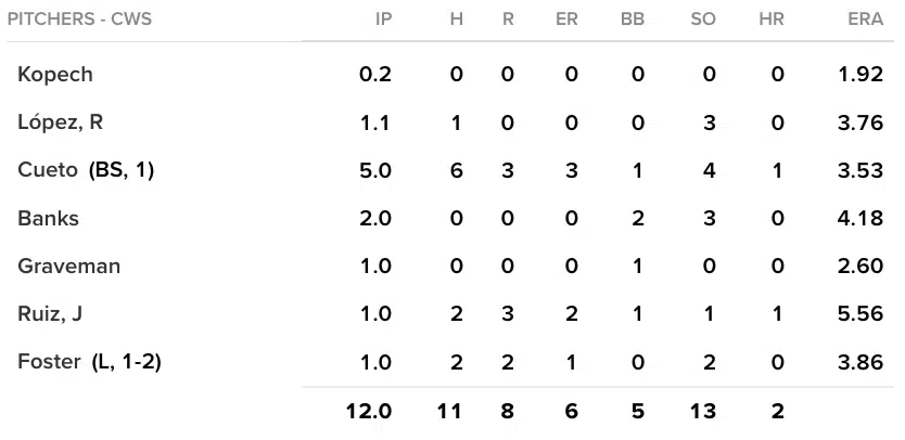 Offensively, the White Sox struggled after scoring early in the first inning. Jon Gray would shut them down until they got to Garrett Richards in the seventh inning. Andrew Vaughn would deliver an RBI single, which would plate two runs—ultimately tying the game. That would be all the offense until the 11th inning when the Sox would score three in a wild frame.