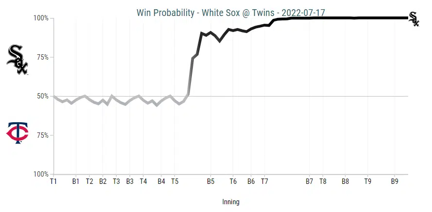 Dylan Cease took the mound today hoping to continue what has been an All-Star-worth first half without the accolade. He was brilliant through seven innings, with the only blemishes being two walks to Jorge Polanco and an opposite-field single by Alex Kirilloff. His final line: 7 IP, 1 H, 0 ER, 2 BB, 8 K. With only 94 pitches through seven innings, the White Sox likely could have sent him back out for the eighth inning had the game not already been put away by the offense. He was followed by scoreless innings by Joe Kelly and Jose Ruiz.