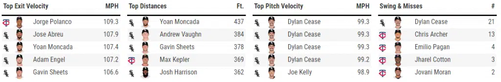 After being blanked through 4.2 innings by Chris Archer, it looked like a step back for the White Sox offense that scored 21 runs in three games. However, a four-run fifth inning sparked by a two-out Seby Zavala walk would lead to a two-RBI single from Tim Anderson and a two-RBI double from Andrew Vaughn to give the Sox a 4-0 lead. That would be plenty for Dylan Cease, but the White Sox weren’t satisfied, going on to score six more runs in the seventh and one more for good measure in the ninth. Yoan Moncada and Andrew Vaughn went back-to-back in the seventh, and Josh Harrison added one of his own that inning as well. All told, the White Sox have hit 13 home runs in their last 14 games.
