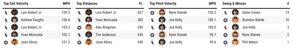 Robert Jr. was the hero in tonight’s ballgame, driving in two of the team’s three runs – including one on a go-ahead RBI single in the bottom of the eighth – to guide the White Sox to their third victory of the season over the Astros. His fourth inning home run opened the scoring, and after extending his streak to five consecutive White Sox runs driven in with the aforementioned RBI single, Seby Zavala joined the party with an RBI single of his own. It was far from a strong performance from the White Sox’ offense, however, it was more than enough for a strong pitching performance tonight.