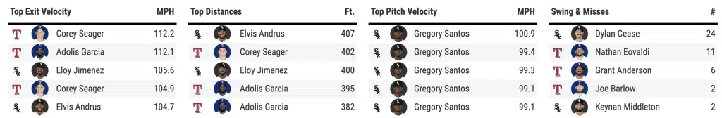 This topsy-turvy game saw the White Sox continue their power streak with another pair of home runs by Eloy Jimenez and Elvis Andrus. Before the craziness of the eighth, Piedro Grifol made the controversial decision of pulling Gregory Santos with two on and two out and replacing him with Aaron Bummer, who subsequently ceded a double to give the Rangers a 6-4 lead.