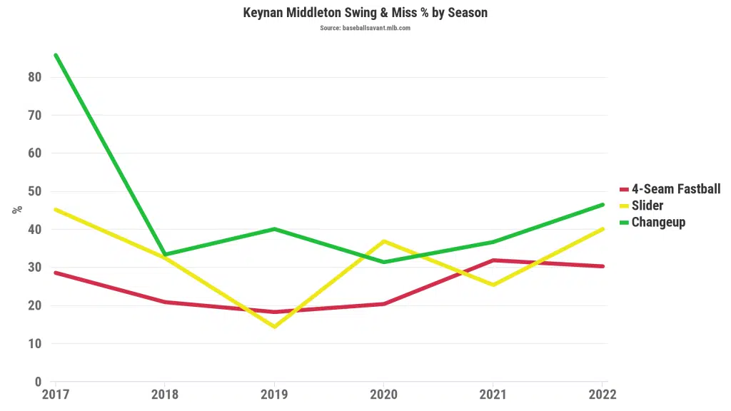 Middleton featured a three-pitch mix – fastball, slider, and changeup – with both his fastball and changeup sitting above 2300 RPMs. His fastball is a pitch with plenty of room for improvement, as just a 90% spin efficiency means he isn’t getting as much life on it as he could be. This is further evidenced by hitters’ .824 SLG against Middleton’s fastball, in 2022. However, with 74th-percentile fastball velocity and 80th-percentile fastball spin, there is plenty in his arsenal for the White Sox to work with. His changeup tunnels very well with his fastball and has consistently gotten the highest whiff rates of any of his pitches – as high as 46.4% last season.
