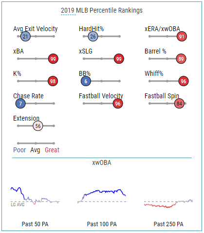 When healthy, James features a three-pitch mix of a fastball, slider, and changeup, and at his best in 2019, he had 50% whiff rates or higher on both his slider (54.9%) and changeup (50.7%). His fastball is also an above-average-spin, high-whiff rate pitch, sitting anywhere from 29%-45% throughout his career. In short: he has really good stuff when healthy.