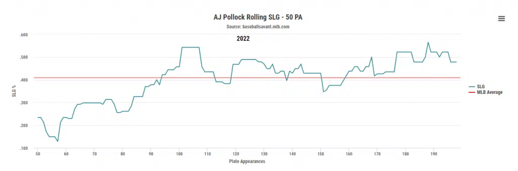Pollock has never been a true homerun hitter or dominant slugger. Having said that, across his career, he’s displayed solid-to-good exit velocity and slugging numbers. From 2015 to the present (since Pollock entered the league), the average MLB exit velocity on batted balls is 88.4 mph. Pollock’s career average exit velocity currently sits at 89.2 mph, with his 2022 number being 88.3 mph. He’s listed in the 37th percentile in the MLB in terms of 2022 average exit velocity. Furthermore, while his 2022 slugging percentage rests at a modest .389, it’s notable that his expected slugging is in the 68th percentile in the majors and his slugging percentage this month is an excellent .463.