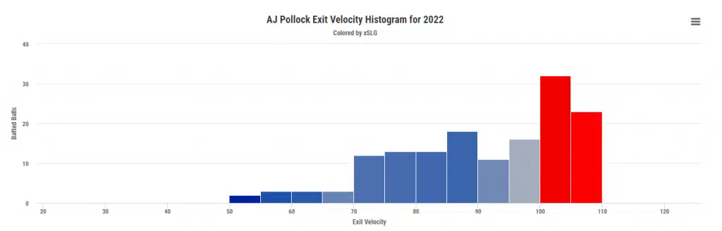 In 2022, AJ Pollock is seeing fastballs thrown to him at a 49.6% clip. Against such offerings, he has maintained an excellent .344 batting average and .548 slugging percentage. What Pollock is doing against heaters is nothing less than destructive. He still has rather quick hands for a veteran player and possesses the ability to identify fastballs in the zone and drive them all over the diamond.