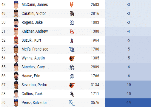 Unlike Yaz, Collins didn’t make up for any defensive liabilities with his bat. In 2021, he slashed .210/.330/.338 with four home runs, good for a wRC+ of 90. In his defense, as a left-handed bat, Collins should have only been deployed against righties and not against lefties. However, due to both Lucas Giolito’s and Carlos Rodón’s seemingly insistence to have Collins as their personal catcher at all times, even with Grandal healthy, Collins would sometimes face lefties to his detriment. Regardless, he only slashed .222/.349/.361, good for a wRC+ of 101 against righties in 2021. This is not overly impressive. Despite a credible OBP, his bat is still barely above average by definition.