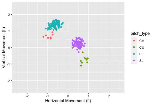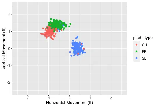 What’s important about the above scatter plot of release points is the variances – the variances are in the vertical direction this season, not in the horizontal direction. This is important because it means Lopez is staying on top of his pitches more, which as we will see in a bit, has an effect on the shape of his pitches.