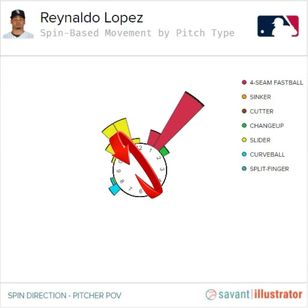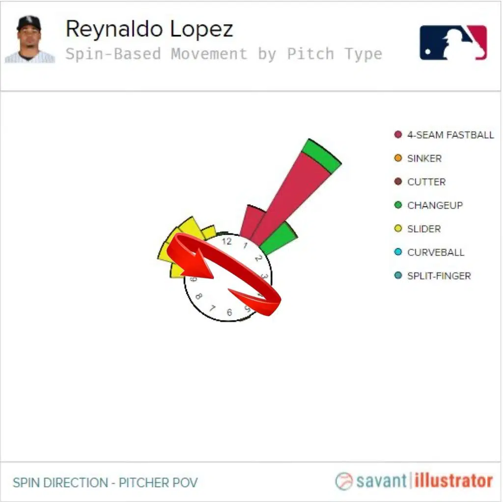The red arrows above show the difference in the spin axis on Reynaldo Lopez’s slider from 2020 to 2021. The spin axis is the direction in which the ball rotates in the air – and we use a clock to represent it (it’s why a “12-6” Curve is named as such). The spin axis on his fastball has changed from 10:00 to 10:45. The most important thing to understand here is that this change in the spin axis shows that Reynaldo Lopez’s slider has indeed changed since 2020 in an effective way with a focus on improved mechanics.