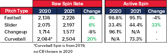I had to do a double-take when I read the average spin rate in 2021 – almost 500 rpms more in 2021?!? For context, that ranks about 70th in terms of average spin across 160 pitchers – so it’s not elite by any means, but it’s a very quality pitch. To add that much pure spin on the pitch as well goes right along with the mechanical changes we discussed before: get on top, drive down the mound, and pull down hard.