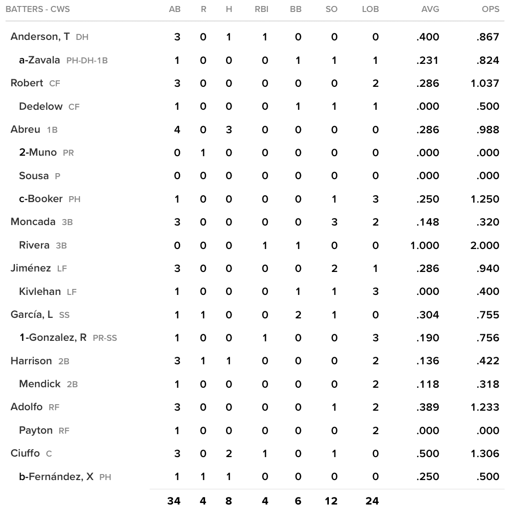 On the offense, the Sox managed to push across 4 runs today. Jose Abreu was a standout today, tallying 3 hits. Potential Backup Catcher Nick Ciuffo opened the scoring with an RBI single in the bottom of the 2nd, scoring Leury Garcia. In the same inning, Tim Anderson added an RBI single of his own, scoring Josh Harrison. Romy Gonzalez hit a sac fly in the 8th to score JJ Muno, and Laz Rivera walked in the bottom of 9th to push across the 4th run of the day for the Sox.