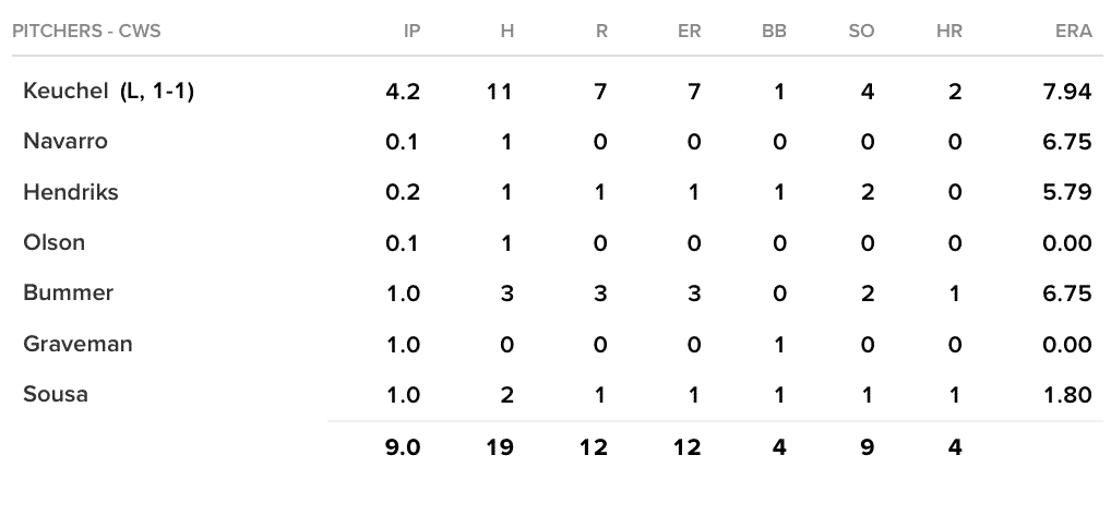 Despite the exciting start to the day with the trade for A.J. Pollock, the Sox fell to the A’s this afternoon 12-4. Dallas Keuchel was on the mound today, and he had a rough day, throwing 4.2 innings and giving up 11 hits and 7 ER, including 2 long balls. Aaron Bummer also struggled a bit, giving up three runs in one inning of work, while Bennett Sousa gave up one run on two hits in one inning. In more positive news, Liam Hendriks threw well today, striking out two hitters, while new White Sox Kendall Graveman threw one scoreless inning.