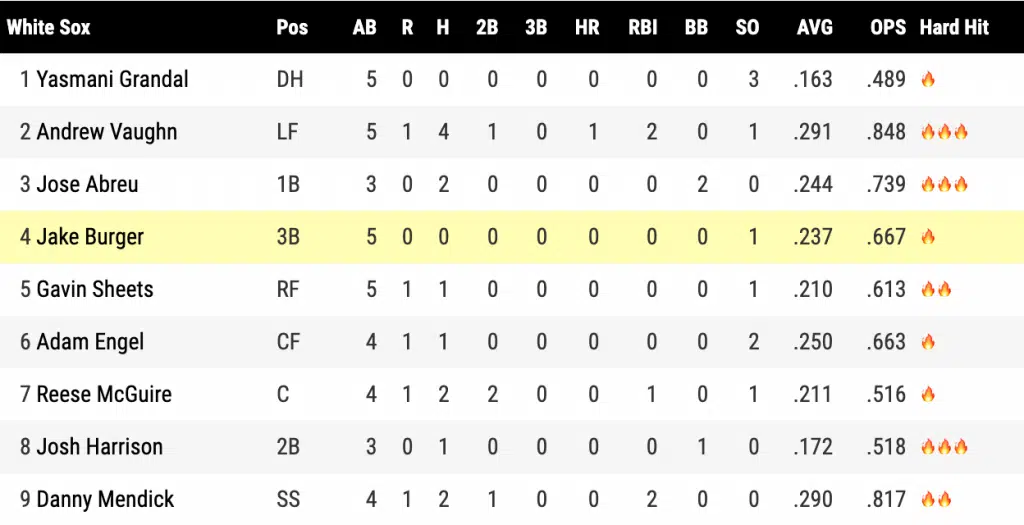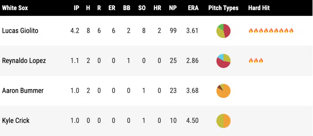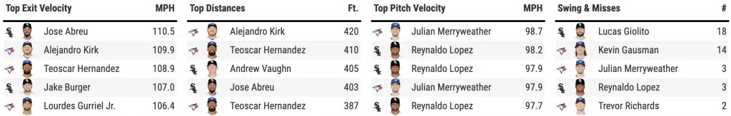 With five starters missing from the lineup, mostly due to injury, a gem was needed from Lucas Giolito, and unfortunately the towering right-hander could not provide. Two Alejandro Kirk home runs, the second on a questionable slider call, and a two-run double proved to be just enough. Andrew Vaughn‘s 4-hit day and a couple of RBI base hits were not enough for Chicago. A promising rally in the ninth inning fell short after a Jake Burger double play groundout and a Gavin Sheets strikeout.