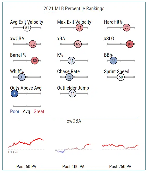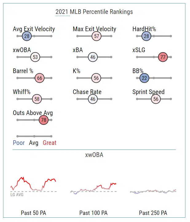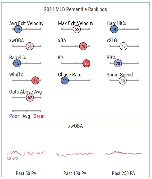Soria, after struggling the first few months of the season, has seen things turn around recently for him. He has posted scoreless outings in 13 of his last 14 games, with a 2.70 ERA over that timespan. His .345 wOBA – compared to a .290 xwOBA – suggests there’s been some bad luck with his poor overall results this season. In addition, he’s walking the fewest batters since 2018 while his strikeout rate remains consistent from his solid 2020 campaign.