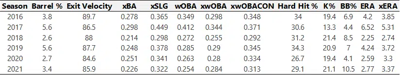The risk is pretty clear in his StatCast scorecard: he doesn’t miss a lot of bats. However, throughout his career, he’s been awesome at minimizing hard contact – mostly because he has pretty solid stuff. Both his changeup and fastball have some nice movement.