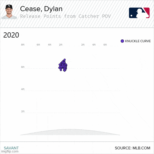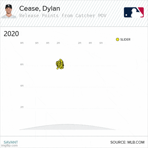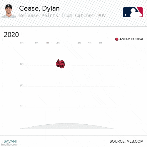 - VERY IMPORTANT: this season, Cease’s variances in release point have varied more vertically than horizontally. This is important because it points to a more consistent arm path. Vertical variances point to how long a pitcher holds on to the ball.