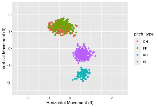 - Looks as if Cease has gotten more vertical movement on all his pitches (all clusters shifted up)