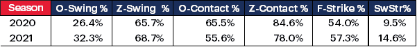 Insane jumps across the board – including more swings and misses from the fastball, the big key prior to 2021. Some of those numbers are absolutely crazy – and they show the importance of both improved stuff and improved command.