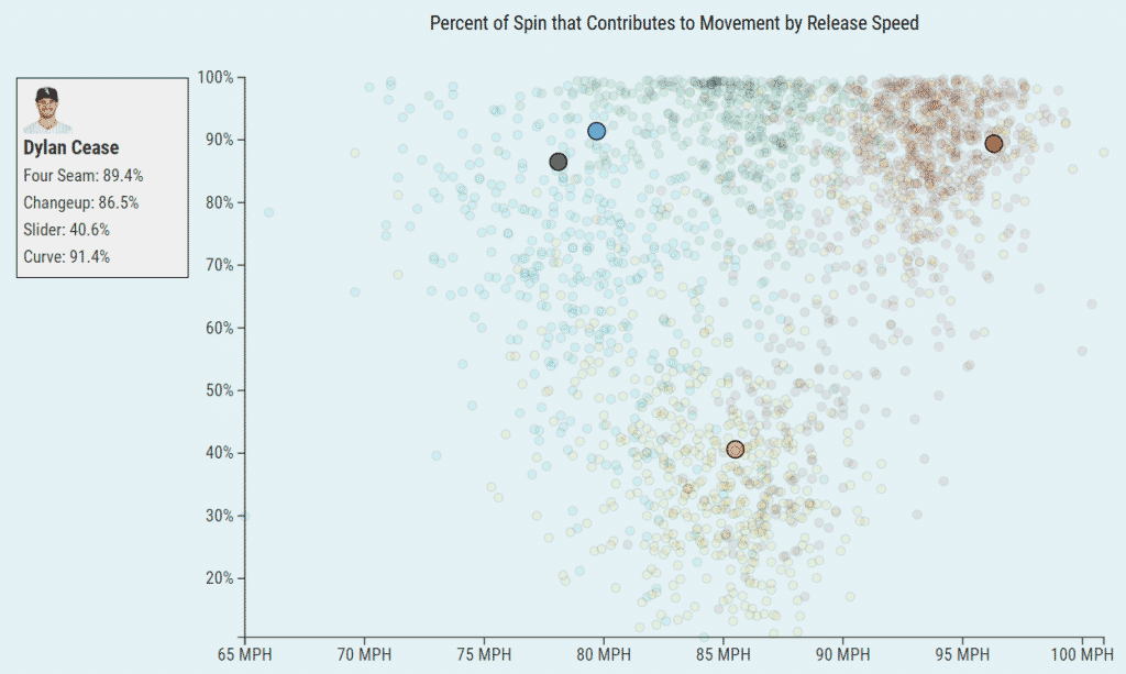 Last year, approximately 82% of the spin on Dylan Cease’s fastball was contributing to its movement. In other words, he had an 82% spin efficiency rating on his fastball. As a comparison point, Lucas Giolito has 99.2% spin efficiency on his fastball – so there was room for improvement.