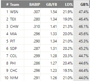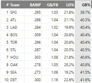 Further, teams that tended to avoid hitting grounders did very well. Six out of the top seven “worst” teams in terms of GB% made the playoffs, and the seventh, the Toronto Blue Jays, still had a fearful offense.