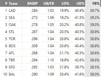 Additionally, teams that hit fly balls ended up doing very well. Out of the top 10 teams that put the ball in the air, 6 made the playoffs. The 11th and 12th place teams, the New York Yankees and Houston Astros, respectively, also made the playoffs.
