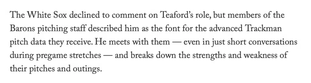 The above is from a James Fegan article on the Barons’ pitching staff. Much like Zaleski, Teaford has earned rave reviews from throughout the White Sox organization. Perhaps the White Sox find a role for the two to work together at the highest level, but for now, Teaford will continue to work at the Schaumburg site with some of the Sox’s young arms. It’s certainly attributable to both Zaleski and Teaford that young power arms have come up and contributed immediately.