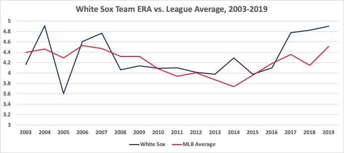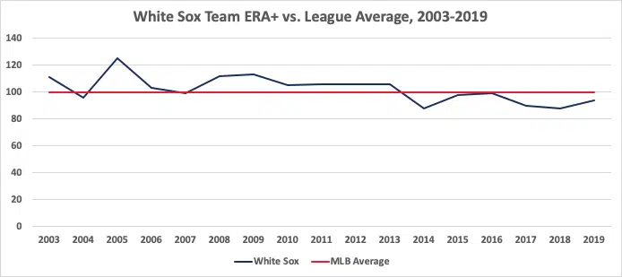 Don Cooper became the pitching coach midway through the 2002 season. He has been a coach in the organization since 1988. From 2003-2019, here’s how the White Sox’s staff has fared in terms of Team ERA and ERA+ as compared to the major league average:
