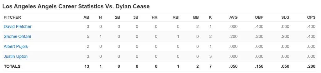 Dylan Cease will take the mound for the South Siders after an encouraging Spring. He does not have an extensive history against the Angels, as shown below.