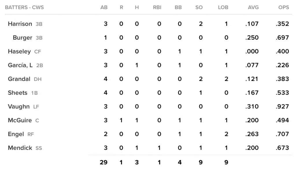 After a pretty brutal performance in Game 1 of the doubleheader, the Sox added insult to injury by dropping Game 2 by a score of 2-1. Guardians starter Tristen McKenzie had it going in this one, throwing four wildly effective no-hit innings before being pulled after giving up his first hit in the fifth. The White Sox bats were once again silent as a result, and even as McKenzie left the game, the team was dominated by Cleveland pitching.