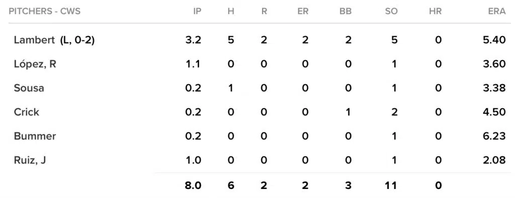 Jimmy Lambert took the mound today for Game 2, going 3.2 innings allowing 5 hits, 2 runs, 2 walks, and 5 strikeouts. Lambert gave the Sox all they could ask for from a guy who is filling a spot in a doubleheader. Reynaldo Lopez, Bennett Sousa, Kyle Crick, Aaron Bummer, and Jose Ruiz all came on in relief and combined for 4.1 scoreless innings and six strikeouts while allowing just one hit.