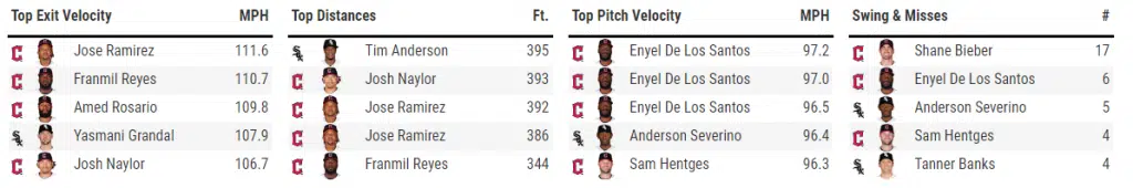 Shane Bieber retired hitter after hitter in this one, posting a stat line of: 6 IP, 4 hits, 1 ER, 7 Ks, 0 BBs. He kept Sox hitters off-balance all game, effectively tunneling his pitches (Stone and Benetti mentioned he’s one of the best in the business at this) and keeping the Sox guessing. His slider looked extremely sharp, he located his fastball in spots that were difficult to hit, and he coasted to an easy win.