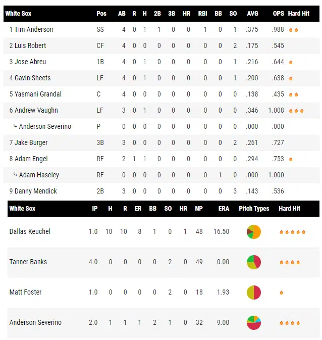 Though no hitter in particular looked good in this one, Luis Robert, in my opinion, was noticeably on an island in his at bats today. He went 0-for-4 with 2Ks, and now hasn’t recorded a hit since April 13th. In his last five games, he is 0-for-20. Though there isn’t an alarming amount of strikeouts in that span (four), he has posted a lot of weak contact. It’ll be crucial for him to get out of this slump at the top of our lineup to help spark this offense as we progress through the early months of the season. Tony La Russa gave Luis the second game of the doubleheader off, a much needed rest for both his body and his mind during this slump.