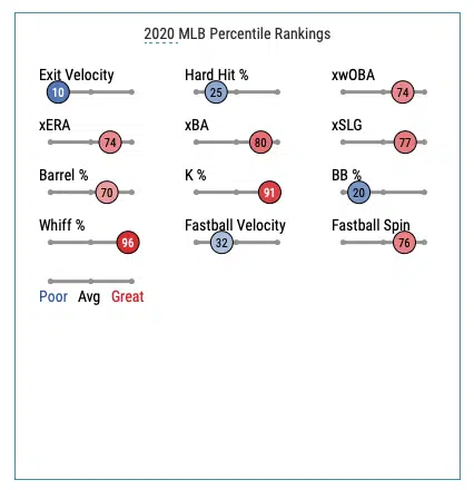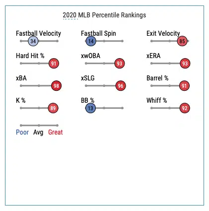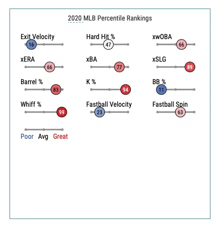 Upside: Shreve is a LHRP who has spent his career pitching for the Mets, Cardinals, Yankees, and Braves. In 2020, Shreve had the best season of his career, posting a 33% K%, 3.96 ERA, 3.46 xERA, .277 xwOBA, and .208 xBA. His BaseballSavant scorecard shows a player that’s great at limiting barreled up baseballs while getting a lot of swing and miss.