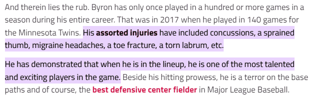 HEALTH: However, Buxton being healthy is a huge “IF”. As Twins fans can attest, it certainly feels as if Buxton is made of glass.