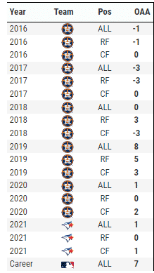 DEFENSE: Per Fangraphs, George Springer has only had one positive season defensively in center field, and that was in 2019. Though Baseball Savant is much more favorable to the former Astros CF: