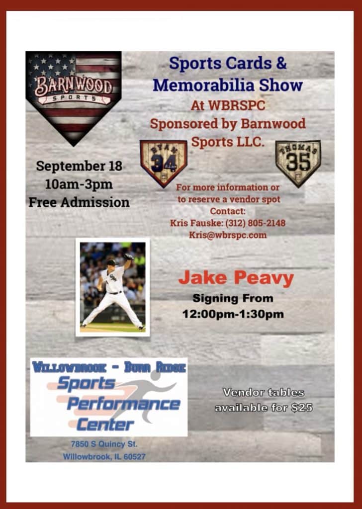 The Willowbrook-Burr Ridge Sports Performance Center will be hosting a Sports Card & Memorabilia Show on Saturday, September 18th. The show is sponsored by Barnwood Sports LLC, and vendor tables are currently available for $25..