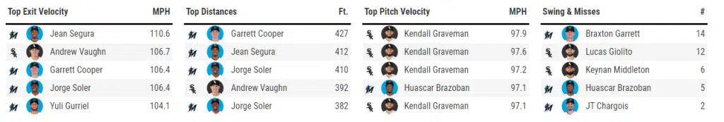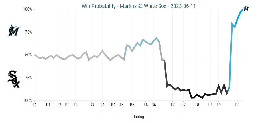 The White Sox offense was stifled by Marlins’ starter Braxton Garrett on Sunday, who blanked Chicago across 5.1 innings. However, Jake Burger and Romy Gonzalez delivered in a big way once Garrett left the ballgame. They both provided massive doubles in the bottom of the sixth, with the former roping an RBI two-bagger (scoring Vaughn) and the latter ripping a two-RBI double (scoring Benintendi and Burger). Luis Robert Jr., as we’ve grown accustomed to, hit a moonshot in the subsequent frame, a two-run home run (scoring him and Clint Frazier) that gave Chicago what appeared to be a comfortable lead (5-1).