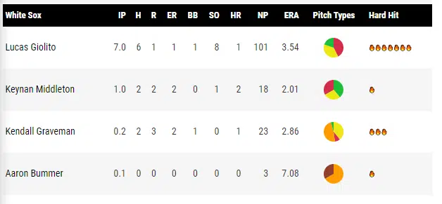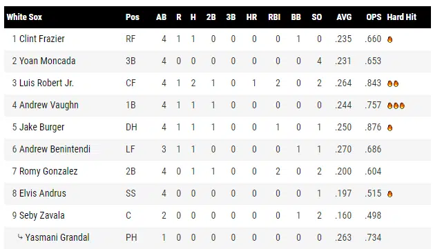 - Bottom of the 6th: González doubled to left. Benintendi and Burger scored. 3-1 White Sox.