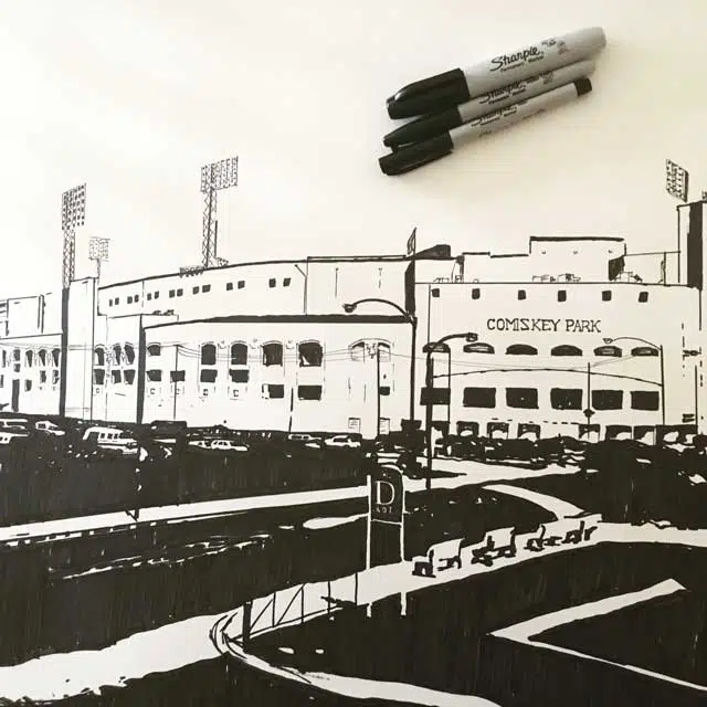 I mostly draw from pictures. I usually have a player in mind, and then search online or through books or baseball cards for an interesting shot that would translate well to a sharpie drawing. I’m also addicted to the look of old Comiskey Park, so I get a lot of inspiration from the arched windows and old brick walls.