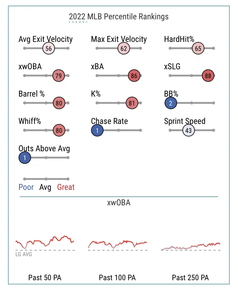 Tim will be fine, but he is at the top of his game when he is working the count, and getting into good hitters counts. Get into good hitters counts, and work the count the higher your chances are to get on base. Tim does not walk and it is clear because in the graphic below his BB% is in the 2nd percentile. Anderson doesn’t need to become Yasmani Grandal when taking walks – he just needs to make sure he is picking out good pitches to hit when he is as aggressive as he is.