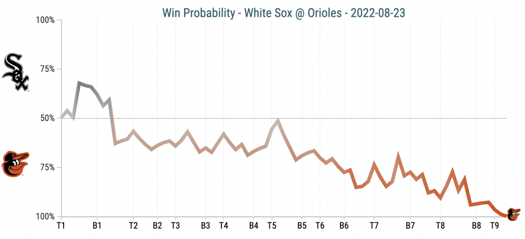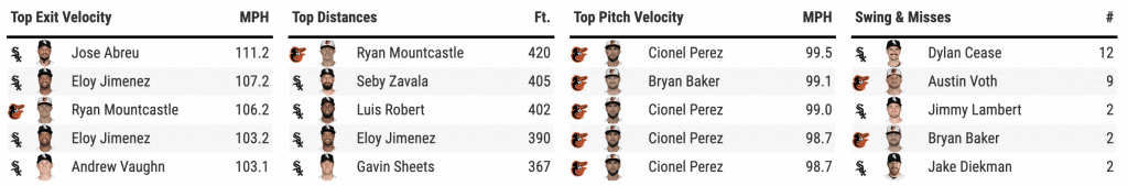 Meanwhile, Dylan Cease had a similar outing, yielding a 3-run homer to Ryan Mountcastle in the first inning and then recovering nicely for a 5.1 IP, 4 ER outing. A bunt single by Cedric Mullins and a hard-earned Adley Rutschman walk set the stage for Mountcastle, who worked the count to 3-1 and then smacked a meatball slider over the center field wall. Baltimore would tally just three more hits but score twice more in the game via an Anthony Santander single in the sixth off Cease and a Jorge Mateo single in the seventh off Jimmy Lambert.