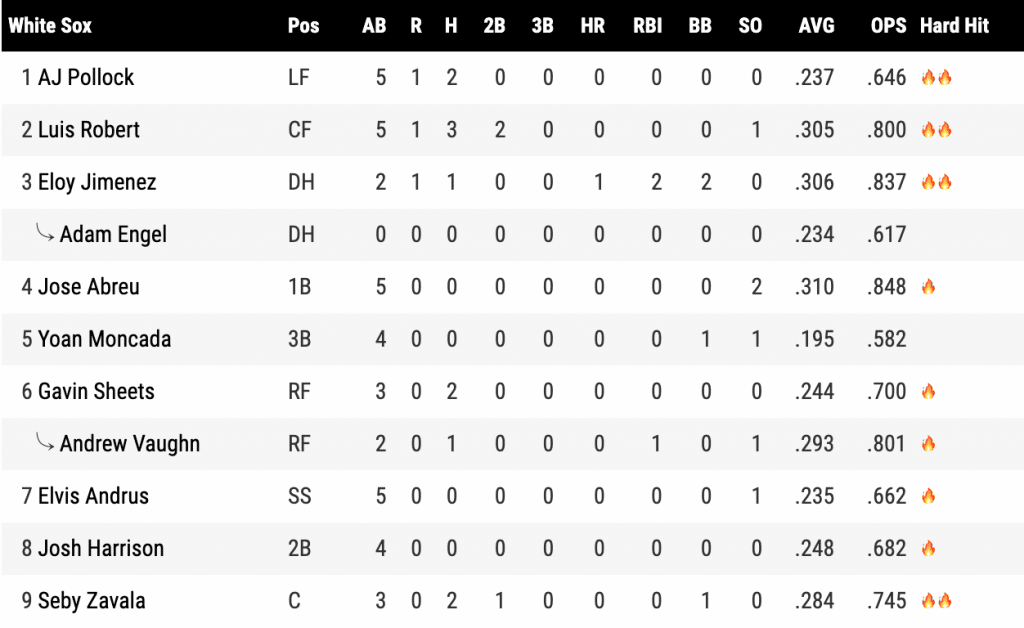 Jimenez continues to be one of the most consistent bats in the Chicago lineup, driving one out over the right-center wall in the first and then proceeding to get on base three more times. He was hit by a Felix Bautista 102 mph fastball in the eighth inning, though, and Sox fans everywhere are bracing for that injury news. On the year, Eloy has a .306/.372/.465 line at the plate.