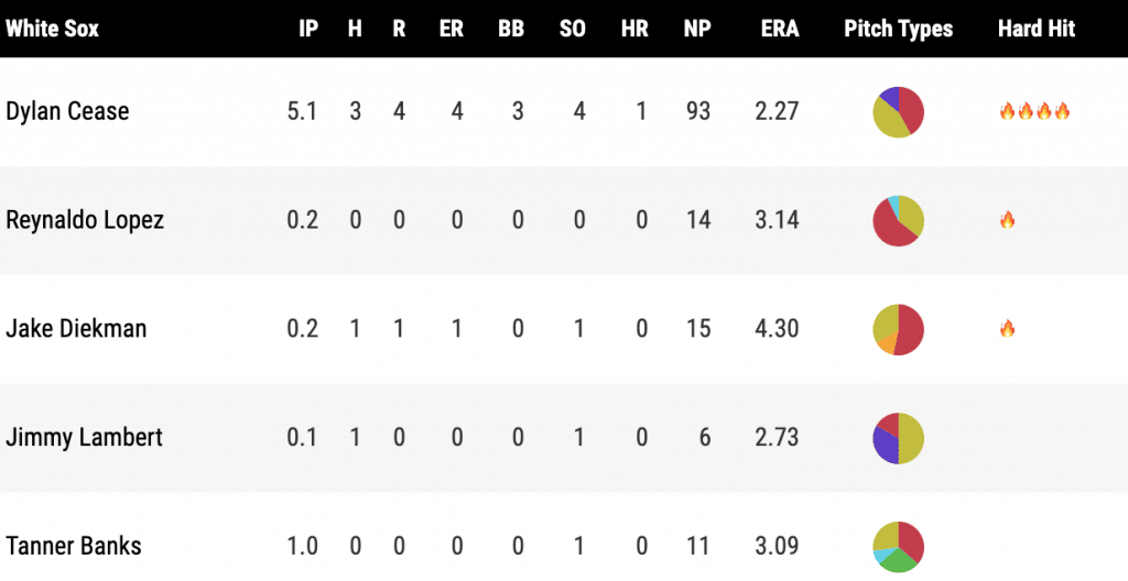 Dylan Cease: 5.1 IP, 4 ER, 3 H, 3 BB, 4 K