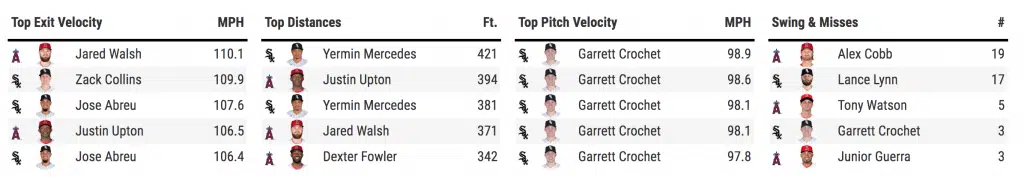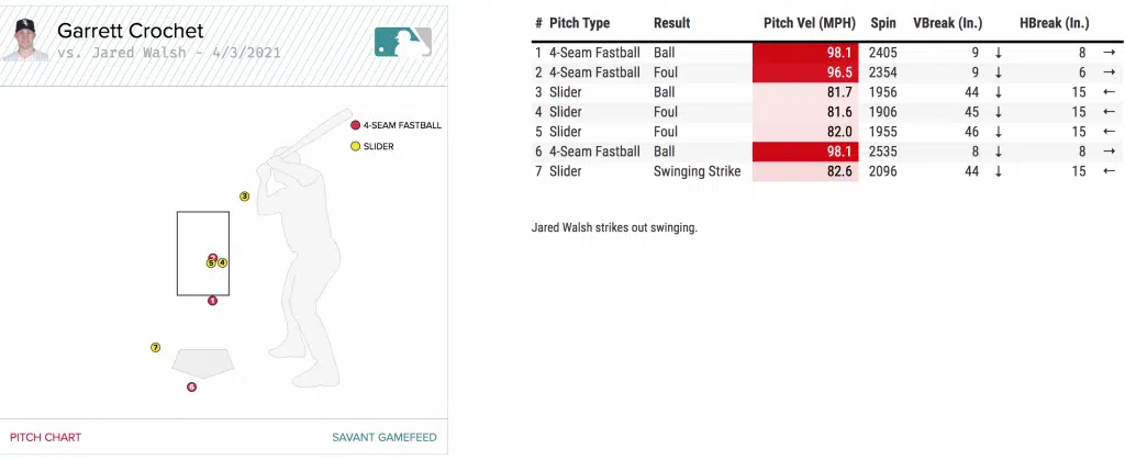 Garrett Crochet relieved Lance Lynn in the 5th inning and had a very interesting matchup with a powerful lefty in Jared Walsh. After falling behind in the count, Crochet employed a more slider-heavy approach and eventually got Walsh to strike out on a slider with two runners on base, preserving the White Sox lead at the time. Crochet’s strikeout of Walsh raised the White Sox win probability from 44% to 50%. However, this clearly would not hold in the end.