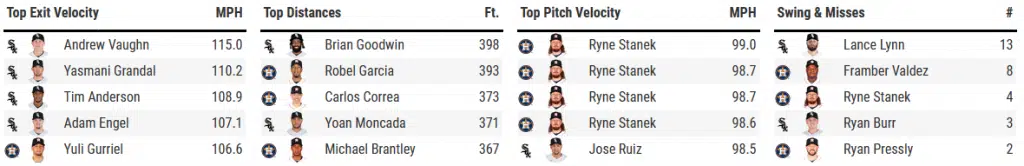 The game got off to a rocky start in the 1st inning with a Moncada error, which led to the runner scoring. He made up for it by driving a RBI double to left-center field in the 3rd that tied the game at one at the time – and would be last time the Sox would be close. In the bottom of the inning, the Astros scored 4 including a bases clearing double from Robel Garcia. In the 4th inning, they struck again with a rocket off Brantley’s bat to score Myles Straw and increase the lead to 6-1. Lynn only lasted 4 innings in his worst start this season. In the 7th inning, Vaughn smashed a line drive for solo home run after being pulled in last night’s game with a facial contusion. Later in the inning, Danny Mendick scored on a throwing error on Maldonado. The bullpen handled the load well, with only Jose Ruiz giving up a solo home run to Carlos Correa.