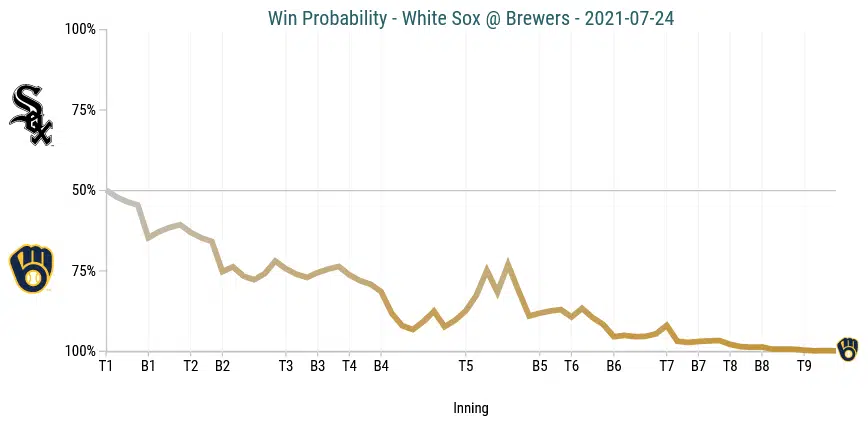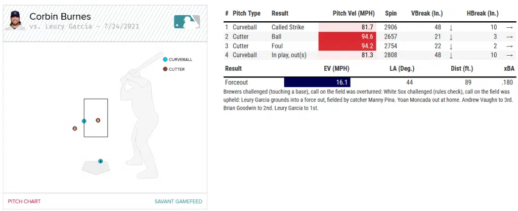 After three straight singles, Leury Garcia came to the plate with the bases loaded and no outs in the 5th. On a 1-2 count, Garcia hit a weak ground ball that ended up with a very confusing play at the plate. Long story short, Yoan Moncada missed home plate and Brewers manager Craig Counsell appealed the play and got a review. After several minutes and two calls to the New York replay room, Moncada was ruled out. This situation seemed to kill any momentum the offense had.