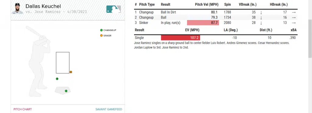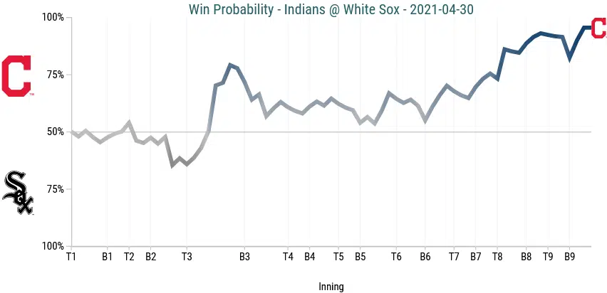 In the 3rd inning, Keuchel gave up a single and walked two to load the bases. With the bases loaded, Jose Ramirez came up to bat. After gaining an advantage with a 2-0 count, Ramirez ripped a sinker just off the plate to center field to score Gimenez and Hernandez. This event raised the Indians’ winning percentage from 0% to 50%, and this really ended up being the game-defining at-bat in today’s game.
