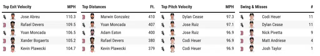 Dylan Cease continued to show improvement today, though a quick hook and some unfortunate missed calls leads his stat line to look worse than his actual performance. His 28% Whiff % on his fastball and 33% Whiff % on his slider both show continued improvement over his 2020 season, but he continues to struggle with getting strike one. However, he has a 65% strike % today – he continues to look better than his box scores show. However, having thrown just 85 pitches when he was pulled, I would’ve liked to see him work deeper. It’s a long season though, and Cease continues to improve.