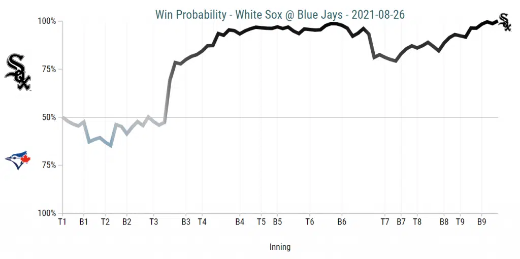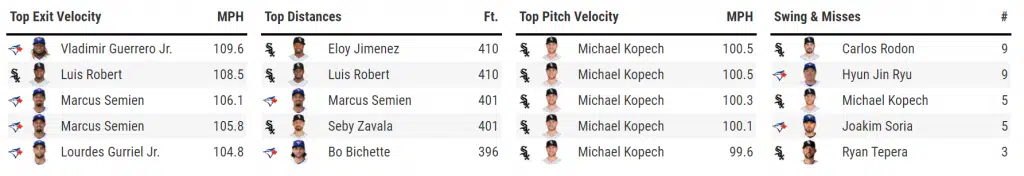 The Blue Jays wouldn’t go away quietly, however, scoring five runs off of Michael Kopech in the bottom of the sixth inning, pulling the Blue Jays within two runs at 9-7. That’s as close as they would get, however, as Ryan Tepera, Garrett Crochet, and Craig Kimbrel shut the door to secure the series split, and Eloy Jimenez added some insurance with a home run of his own in the ninth.